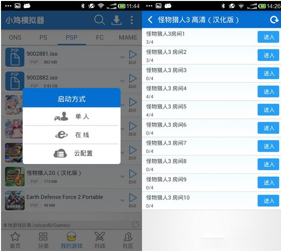 ②点击【我的游戏】→点击怪物猎人的【启动】→点【在线】→选择房间点击【进入】→游戏中进入和房间相同数字的集会所。