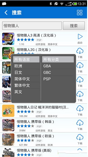 7、在主界面的搜索框,或者点击上方的“搜索”图标,然后输入游戏名字即可进行搜索。指定内容会在全平台中进行搜索,当然如果你想特定某一平台,亦可触摸搜索结果界面右上角的分类图标,选择平台