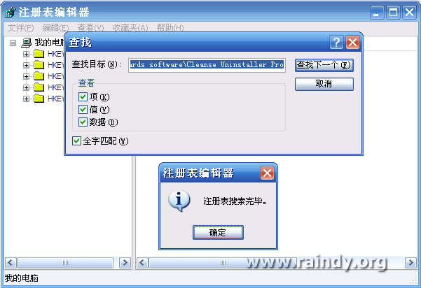 在“开始”菜单-“运行”中输入“regedit”,打开注册表编辑器,搜索“C:\Program Files\Zards software\Cleanse Uninstaller Pro”,由于注册表中搜索不到安装路径(如下图所示),只能搜索主程序以获取完整路径。