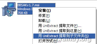 1.解包 MSI 文件:建议使用 Universal Extractor 万能解包工具解包,该工具可以集成到右键,选择“用 UniExtractor 提取到子文件夹”,如下图所示: