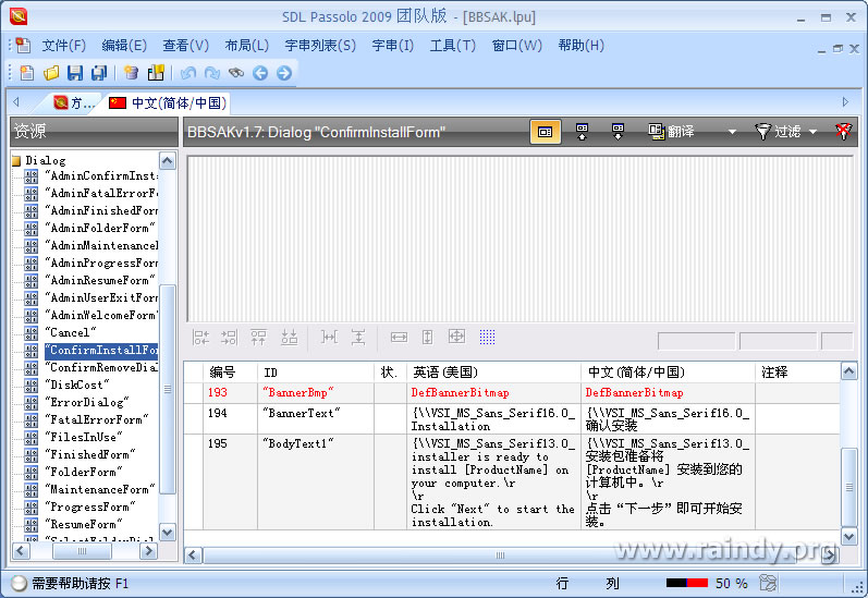 3.汉化解包后的 MSI 文件:MSI 安装界面为英文,也可以使用 Passolo 来汉化界面,如下图所示: