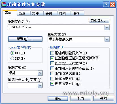 选取待压缩的文件,鼠标右键选择“添加到压缩文件”(前提需要安装WinRAR,这个几乎人手必备),弹出对话框如下图示示,压缩方式选择为“最好”,分别钩选“创建自解压格式压缩文件”、“锁定压缩文件”,后者主要可以防止相关文件或信息被人篡改。
