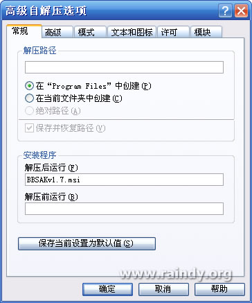 从上图的“常规”标签切换到“高级”标签,依次点击“自解压缩选项”->在弹出的“高级自解压选项”窗口,点击“常规”标签->“安装程序”下方输入自解压后运行的程序,即:BBSAKv1.7.msi,这个是前面 UniExtractor 解压得到的 MSI 文件,如下图示: