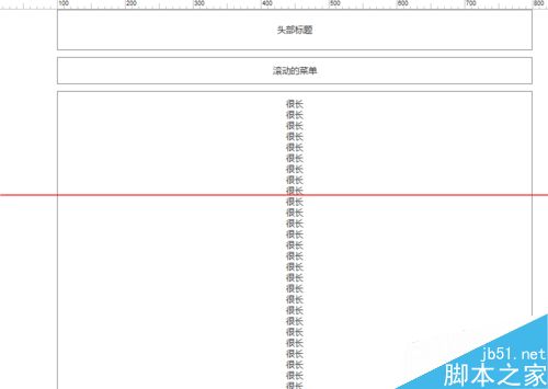 为了体现效果,我们需要做一个比较长(高)的页面,在Axure工作区中拖入4个矩形,分别为顶部标题、菜单、页面内容、底部。设置矩形宽度和高度,让其看起来像是一个页面布局。