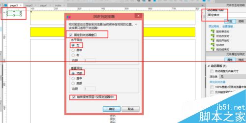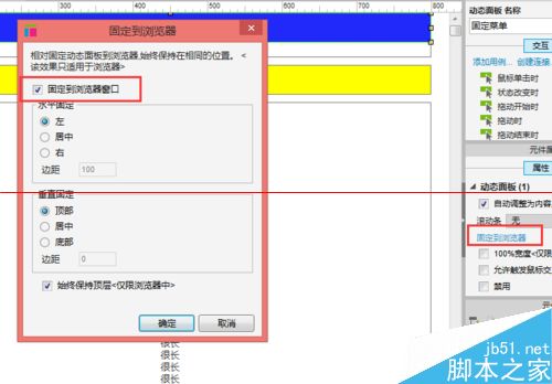 在工作区中拖入一个动态面板,设置其x和y坐标等于0,调整其宽度和高度分别为60和20,将动态面板命名为“固定锚点”,设置其固定到浏览器。