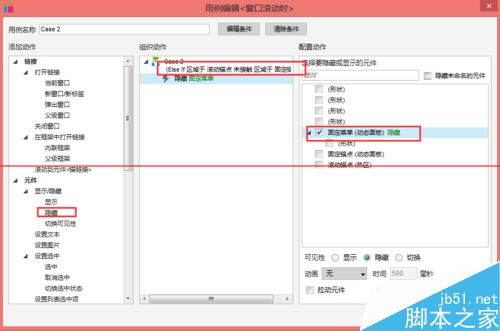 继续在“窗口滚动时”事件上添加动作,添加条件“元件范围 滚动锚点 未接触 元件范围 固定锚点”,确定,设置动作为“隐藏 固定菜单”。