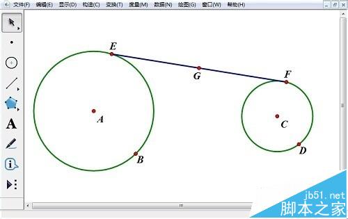1、选择“圆工具”绘制出两个相离的圆,并修改好标签,在两个圆上分别选取任一点E、F。