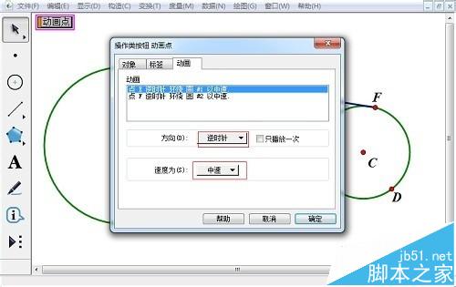 3、选中点E、F,选择“编辑”—“操作类按钮”—“动画”命令。可以让点E、F按照同一方向(即逆时针或者顺时针)运动,也可以让点E、F按照相反的方向(即双向)运动。
