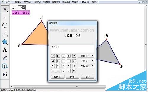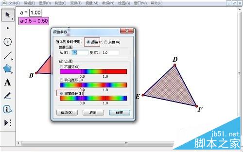 4、选定参数a和三角形ABC内部,选择“显示”——“颜色”——“参数”——“颜色”——“双向”——“确定”。选定“参数a*0.5”计算值和三角形DEF内部,进行相同的设置。