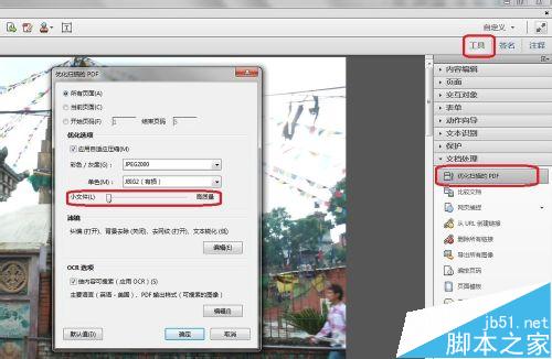 3、点击“优化扫描的PDF”,弹出对话框,如上图。红框中的滑动模块,向左是减小文件的大小,但降低文档的清晰度,向右是高质量即高清晰度,但文件会较大。