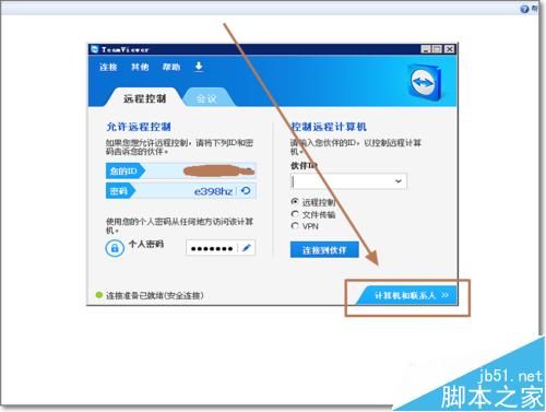 1、首先去官方下载最新版本的TeamViewer,默认下一步下一步安装完成,打开进入下图主界面,点击计算机和联系人。