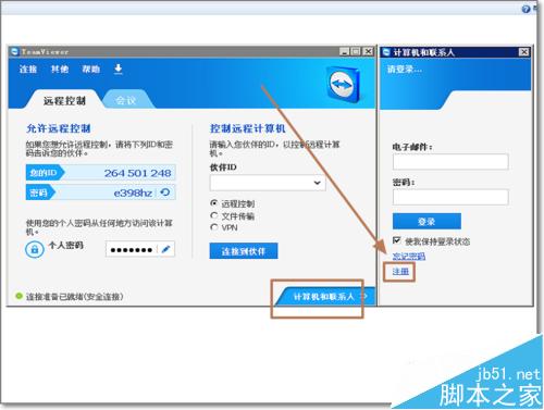 2、右则滑出计算机和联系人账户登陆界面,在没有注册TeamViewer账号前,点击注册,进行新用户注册。