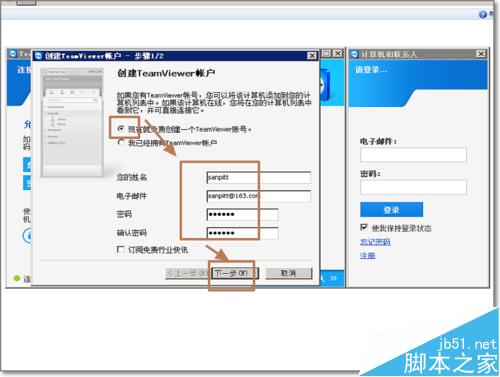 3、填写:电子邮件-密码-下一步-完成,为什么要注册一个TeamViewer帐户呢?因为我们可以将我们的经常控制电脑加入到我的伙伴中。在另一端也使用自己的账户登陆后在我的伙伴中可以看到加入的电脑。直接点击,不用输入密码就可以远程控制。