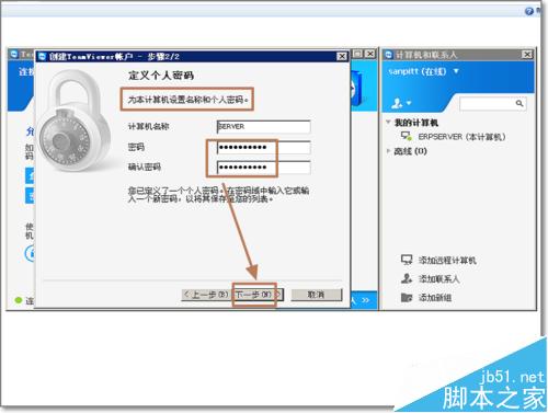 4、创建TeamViewer账户的过程中,同时要求定义个人密码,这是密码就是固定密码,以后将做为这台被控制电脑在另一个端访问它的固定密码。不用向对方询问远程控制的临时密码。