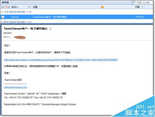 5、注册TeamViewer帐户后,进入你的注册邮件,TeamViewer官会发一封确认链接地址,激活帐户。这也是以后找回密码所需要的邮件。
