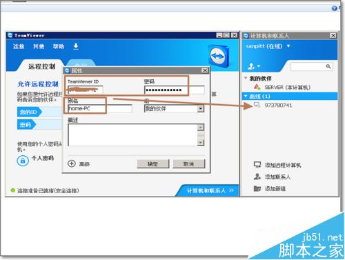 7、登陆后,可以看到本机的电脑名字,点击增加远程计算机,可以将另外一台需要远程控制的电脑加入到我的伙伴中,如图,若远程计算未开机或未联网,在我的伙伴中看到计算机是离线状态的。同时也可增加其它注册过TeamViewer帐户的成员,相当于好友。相互之间可以快速连接,比如远程视频会议。