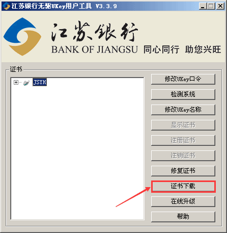 2、将ukey插入电脑usb接口,安装ukey中的驱动程序,然后执行江苏银行ukey工具(这个时候可能要求设置ukey的密码,一定要记住了,最后要用,千万不要输入错误了),内有证书下载选项