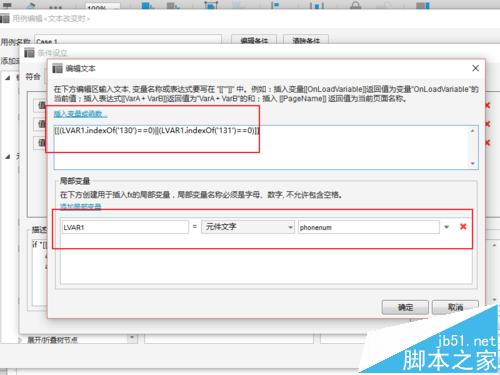 在case1上继续添加判断,插入变量利用indexof来判断:130 131等号段是否出现在前三位即可,函数:[[(LVAR1.indexOf('130')==0)||(LVAR1.indexOf('131')==0)]],LVAR1的设置参考下图,依然是phonenum的元件文字: