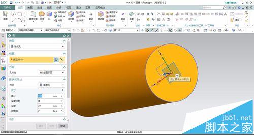 绘制孔的方法二:点击绘制孔的图标,然后你需要绘制一个点,选择为圆柱的下表面的圆心作为点。然后按照自己的需求来绘制什么类型的孔。