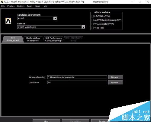 1、首先,双击打开ansys12.0软件,其他的版本都可以,只要进入了ansys经典界面即可。然后选择工作路径和文件名,点击run。(该经验先绘制实体,以轴承座为例)
