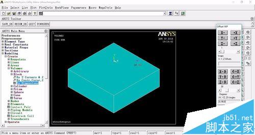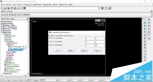 3、我们先绘制一个长方体,Main Menu>Preprocessor>modleing>create>volumes>block>by dimension,输入长宽高的长度,分别为(0,3)、(0,1)、(0,3)。点击OK即可。也可以更改视图方向。