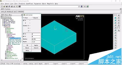 5、创建实心圆柱体,Main Menu>Preprocessor>modleing>create>volumes>cylinder>solid cylinder输入位置(0,0),半径0.375,深度为-1.5,即可完成圆柱体的创建。