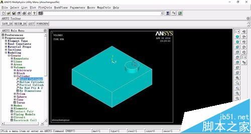 7、布尔求差运算:Main Menu>Preprocessor>operate>booleans>subtract>volume,首先选择长方体,单击apply,再选择2个圆柱,单击OK,效果图如下图所示。