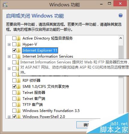 3、进入后将Internet explorer11前的√去掉就行了。然后点击确定。重启一下电脑就OK了。当然你要是想装上IE11的话,添加上√就行了。