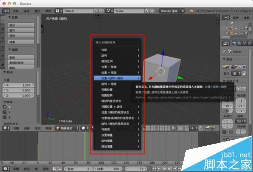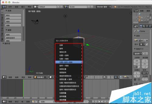 1、选择物体,然后在菜单中“物体”--“动画”--“插入关键帧”,或者直接“i”,调出“插入关键帧菜单”,在其中选则自己需要的动画方式。