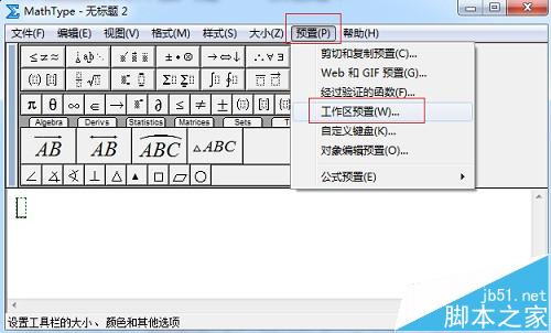 2、在MathType菜单栏中,选择“预置”——“工作区预置”。
