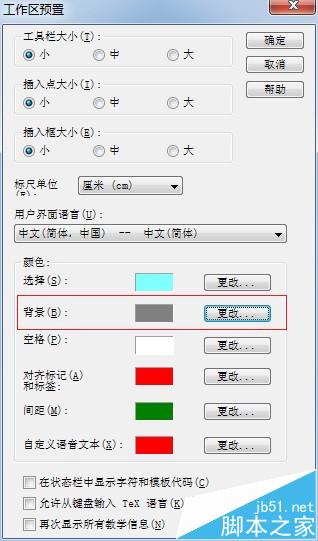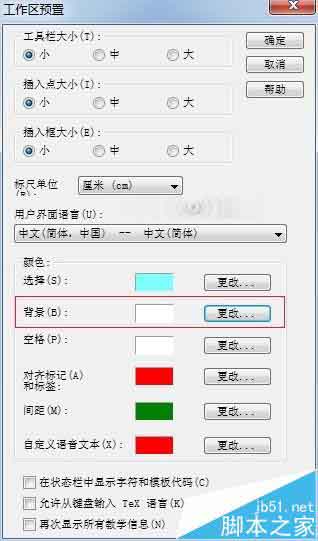 3、进入工作区预置后,会弹出一个“工作区预置”的对话框,在这个对话框的下部,有一个“颜色”功能,我们看到在“背景”这一栏中,颜色是白色,点击“背景”后面的“更改”按钮。
