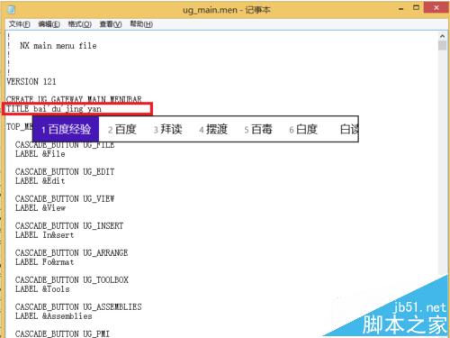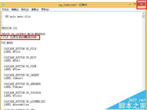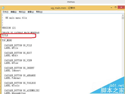 2、打开 ug_main.men 文件,在文件中找到 TITLE 行。