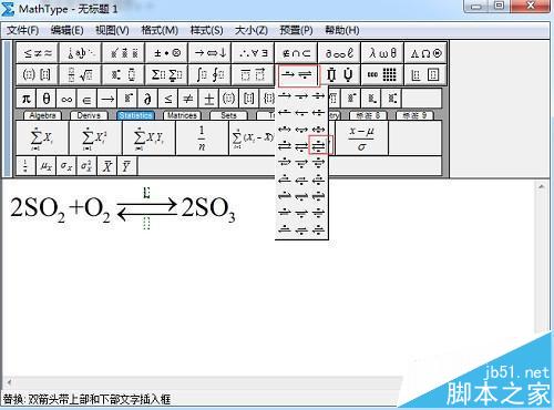 在编辑化学反应方程式的时候会涉及到一些格式与符号问题,最明显的就是化学反应条件这个符号,一般是等号或者可逆符号。下面介绍MathType可逆符号的编辑方法。
