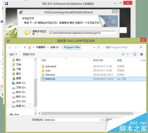 4、在进入到找寻许可证文件后,选择一开始更改过计算名的NX8.0.LIC文件;(也就是复制到D盘Program Files文件夹内LIC文件)