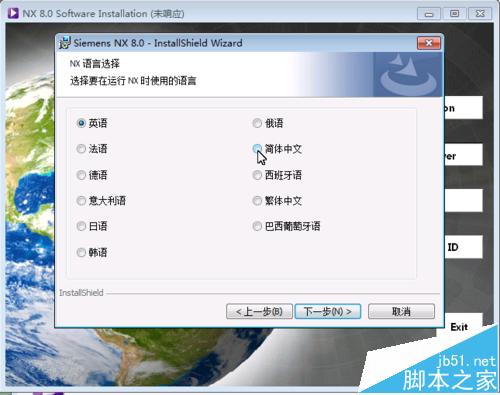 1、在返回到UG8.0的安装界面后,点install NX;选择语言为简体,当然你也可以选择英文;