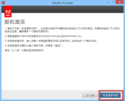 点击“脱机激活”,并接着点击“生成请求代码”。