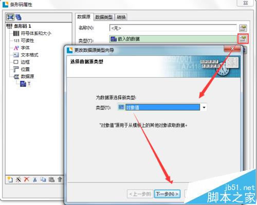 2、双击条码,将数据源类型修改为“对象值”。单击下一步。