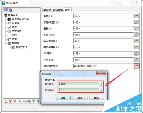 4、切换至“转换”选项卡,点击“前缀和后缀”后面的按钮,输入前缀9002,后缀812,点击确定,点击关闭。已完成BarTender数据之间的关联,可以修改文本数据,查看设置是否无误。