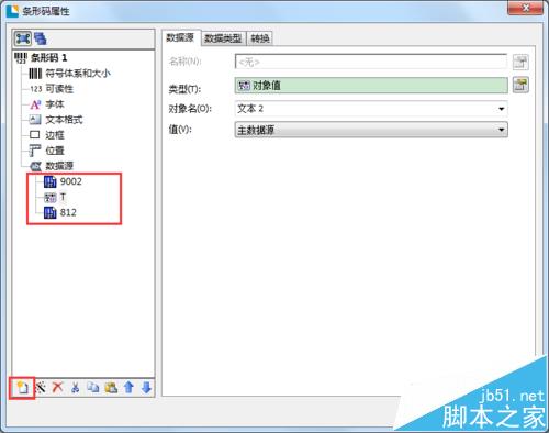 2、双击条码,打开条码属性对话框,分别新建数据源9002和812,调整数据源位置。