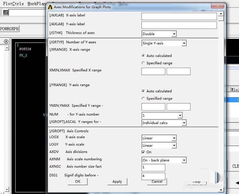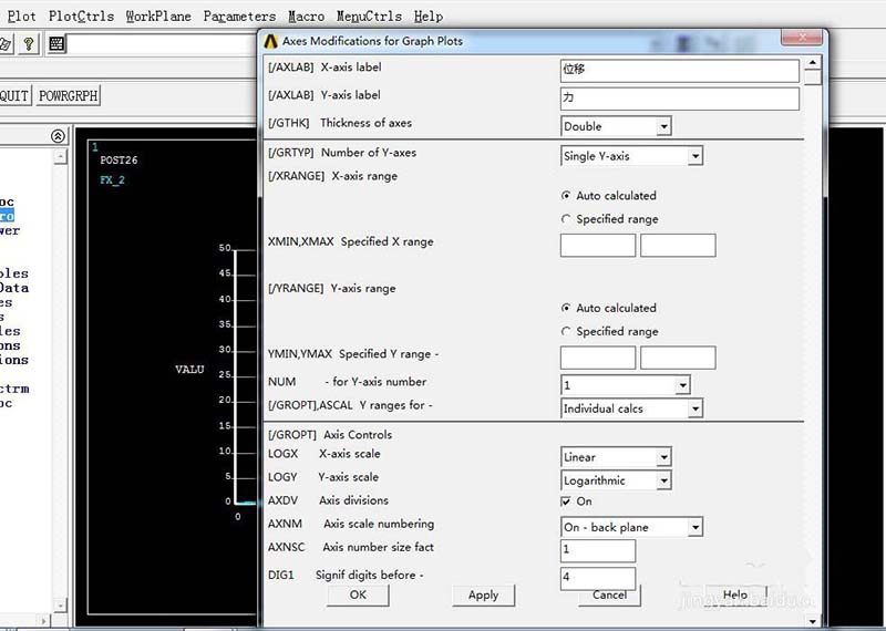 7、在[/AXLAB] X-axis label左边的框里填写你所像要显示的X轴坐标名称,这里填写为“位移”,同样在[/AXLAB] Y-axis label左边的框里填写你所像要显示的Y轴坐标名称,这里填写为“力”,填写好名称后,点击左下角的“OK”按钮即可,如图