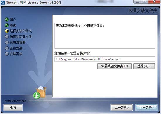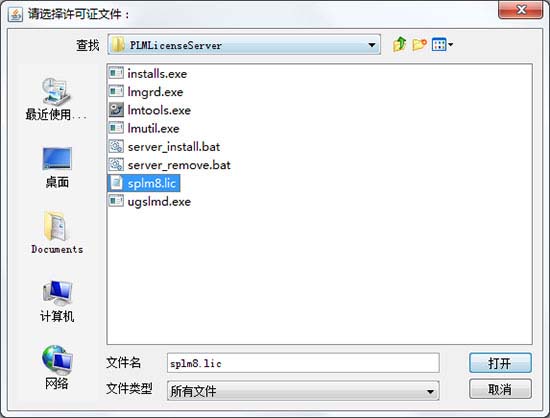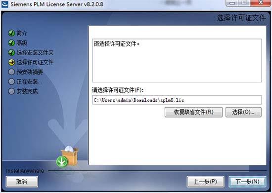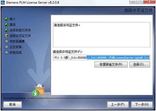 4、许可文件这里,我们选择“_SolidSQUAD_\PLMLicenseServer”目录下的“splm8.lic”载入,然后完成安装