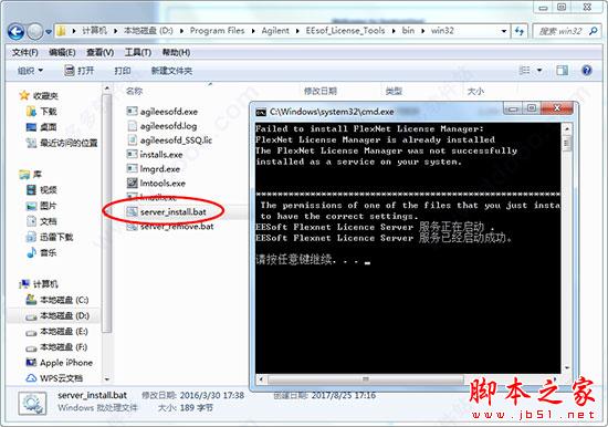 10、打开刚覆盖的EEsof_License_Tools\bin\win32,运行“server_install.bat”启动服务