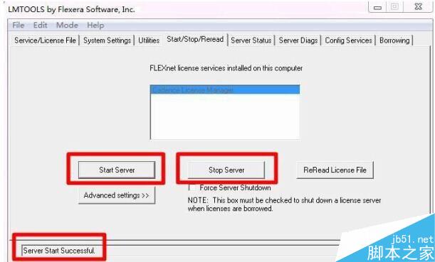 “Start/Stop/Reread”项,先点击“Stop Server”按钮,再点击“Start Server”,可以多次反复此操作,直到提示 license 服务启动成功,到此,破解完成。说明:关于 Start/Stop/Reread”项,若是提示失败,也可以不理会,软件依然可用。