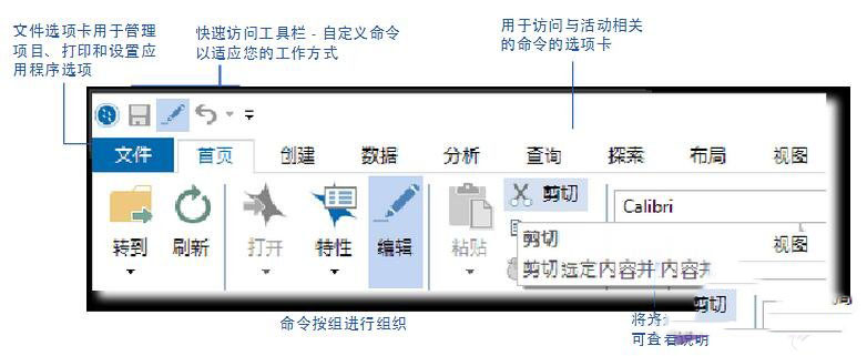 功能区上的命令按逻辑分组并显示不同选项卡下。每个选项卡与一种活动类型(例如创建新项目项或分析您的来源材料)相关。