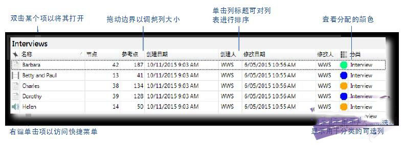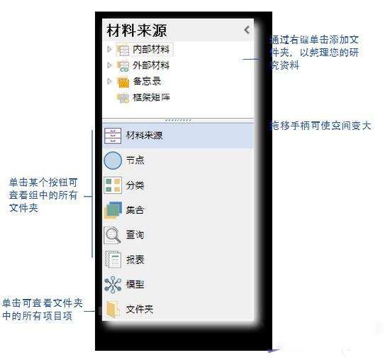 导航视图有助于您组织并轻松访问 NVivo 中的所有项: