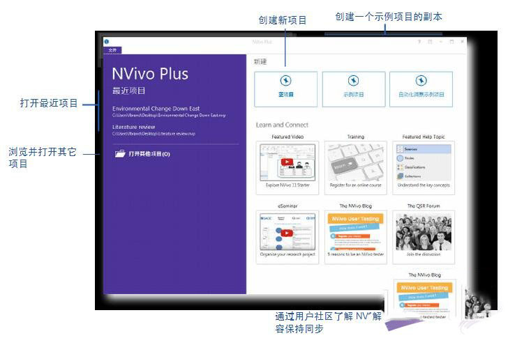 这是您启动 NVivo 后看到的第一个屏幕。在该屏幕上,您可以访问项目并利用在线学习和社区资源以充分利用 NVivo 软件。
