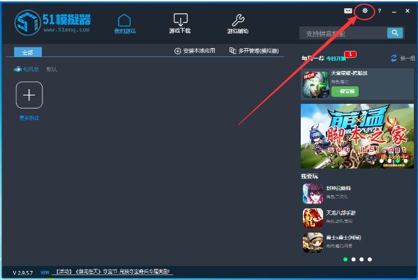 1、首先打开电脑中的51模拟器大厅,然后在其界面右上角打开“设置”;
