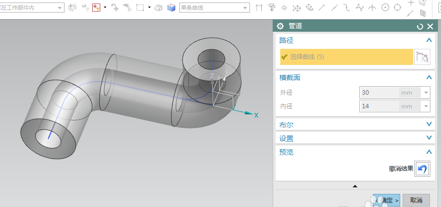 6、选中绘制好的曲线,通过使用管道命令,创建如图1的特征,退出命令后,其零件如图2;