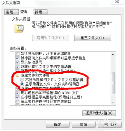 打开 开始菜单 (Windows 8 请按下Windows 按键 + Q),在 搜索程序和文件 中输入 文件夹选项 ,选择 查看 标签,下拉找到并选择 显示隐藏的文件、文件夹和驱动器 。