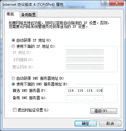 5、然后选择“使用下面DNS服务器地址”,然后我们可以设置固定DNS114.114.114.114 设置完后再次尝试下载游戏即可解决问题。